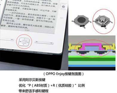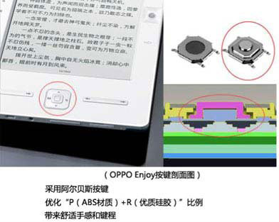 目前按鍵基本采用的都是ABS材質類似電腦鍵盤,有過去網吧經驗的人就知道,通過看鍵盤上字跡的磨損程度和磨損的鍵位就知道近是流行CS還是勁舞團,字跡的耐磨度是一個不小的考驗。目前一般是采用激光鐳雕或者絲印,但是電子書產品一般是白色的面殼,如果采用激光鐳雕會留下比較明顯的痕跡,但如果直接把絲印暴露在外面,長期摩擦字跡就會消失,為了解決這個矛盾,Enjoy創新采用一種夾層工藝,ABS表面首先噴涂底層(主要是著色),然后絲印,后在絲印上再采用噴油工藝,這樣就保證了絲印的耐磨度同時也隔絕了手上汗漬對絲印的侵蝕。