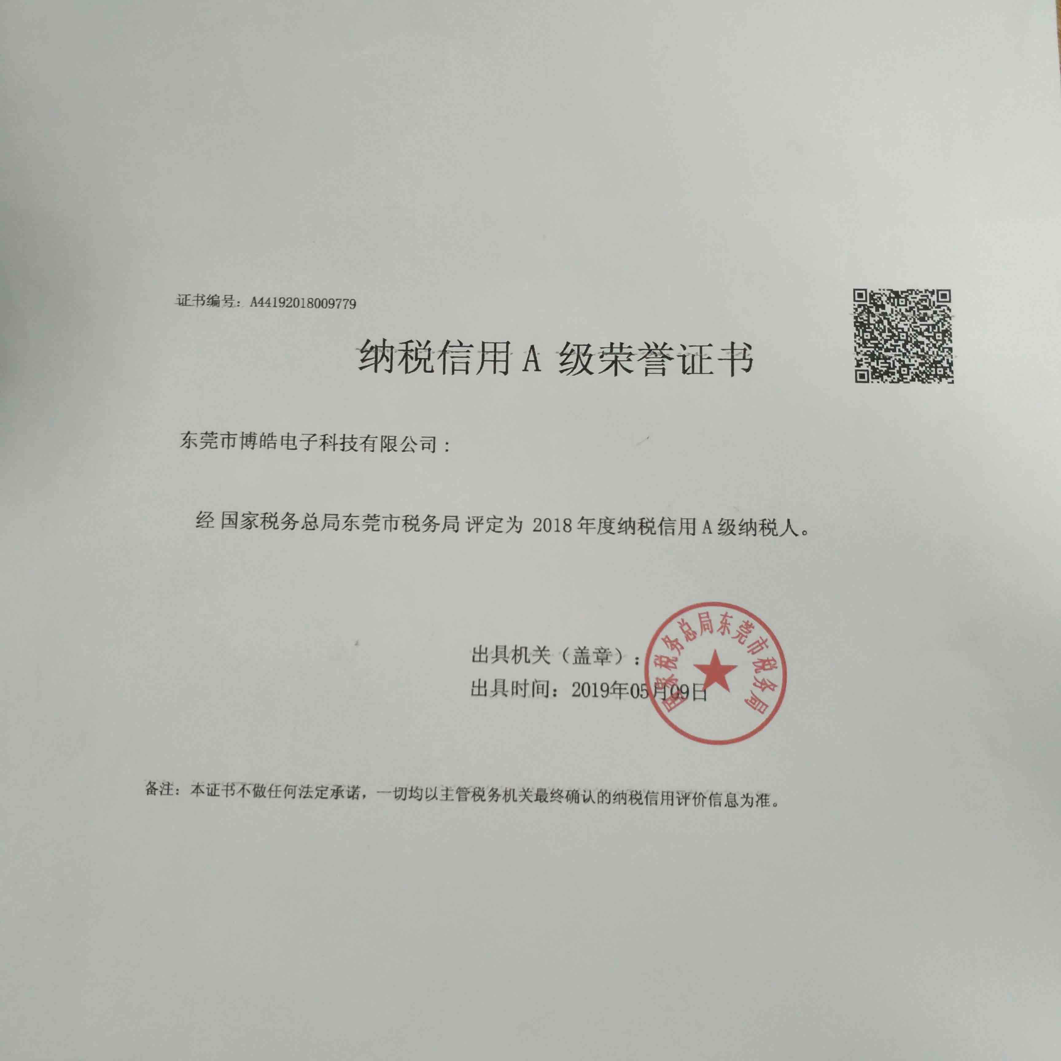 博皓電子硅膠制品廠榮獲“納稅信用A級”