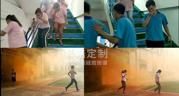 消防演習現(xiàn)場模擬演示一場突如其來的大火,拉起煙霧彈,一時煙霧四起并迅速蔓延,拉起警報后,正在生產(chǎn)汽車硅膠按鍵的家人緊急“逃生”,從東西兩個消防通道迅速、有序撤離。逃生時,員工們彎腰、低頭、用毛巾或衣服捂住口鼻迅速撤離到操場安全區(qū)域,各部門集合整隊清點人數(shù),整個疏散過程緊張、有序。