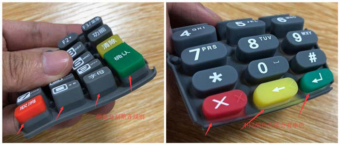 對(duì)于直接和PCB板接觸導(dǎo)電的按鍵來(lái)說(shuō),觸電位置會(huì)用碳粒或是涂導(dǎo)電油墨來(lái)實(shí)現(xiàn)。