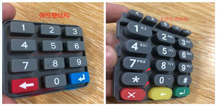 大多數(shù)硅膠按鍵都是選擇用碳粒或是導(dǎo)電油墨來(lái)實(shí)現(xiàn)導(dǎo)電功能,而直接通過(guò)按鍵來(lái)導(dǎo)電則要求按鍵具有按下去彈回來(lái)的彈性壁結(jié)構(gòu)。(鍋?zhàn)衅洼p觸開(kāi)關(guān)他們自帶回彈功能,所以對(duì)應(yīng)的硅膠按鍵一般不需要再設(shè)計(jì)彈性壁結(jié)構(gòu))