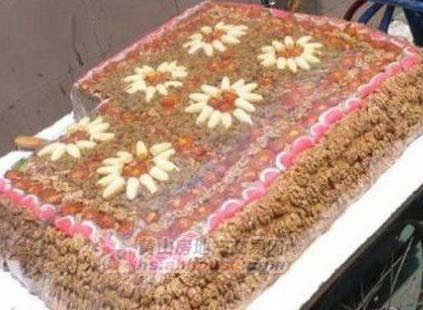 切糕包括核桃、花生、葵花籽、葡萄干、杏干,其實就成本上來說也不算便宜,但也不算多貴。主要靠糖粘合;趁熱將它倒進一個很結(jié)實的木槽之中(木槽由幾塊單獨的厚木板圍成,用粗麻繩和兩頭彎的大鐵釘固定在一起),再用一塊厚木板蓋在切糕上面,木板上面再壓上一些重物,比如石塊或鐵塊,總之要夠重夠分量,大概要4、5個小編的重量才行。就這樣切糕慢慢得被壓到很緊實,里面很多水分也隨著木槽底部的縫隙慢慢流出。兩天之后,移開重物或者小胖們,再撬起鐵釘,解開麻繩,取下木板,一塊結(jié)結(jié)實實,香氣四溢的切糕就呈現(xiàn)在我們眼前了。