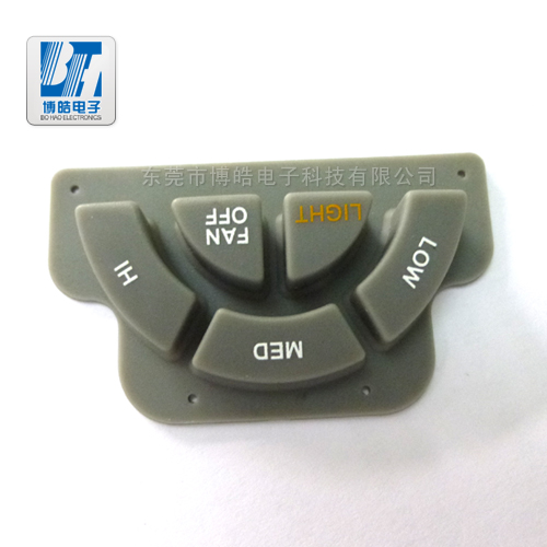 - 產品簡介:該產品適用于任何儀器設備儀表等產品,選用環保無毒無污染硅膠原材料,左側產品可以很清晰看到是灰色硅膠按鍵,這是經過博皓電子專業配色師父調制而成。表面英文字是采用絲印工藝,在該產品上面主要絲印了有“白色和黃色油墨”。在該按鍵底部配有導電黑粒,可起到導電效果。博皓電子也可跟客戶需求來開模定制硅膠按鍵,為客戶量身定做更適合的硅膠按鍵。